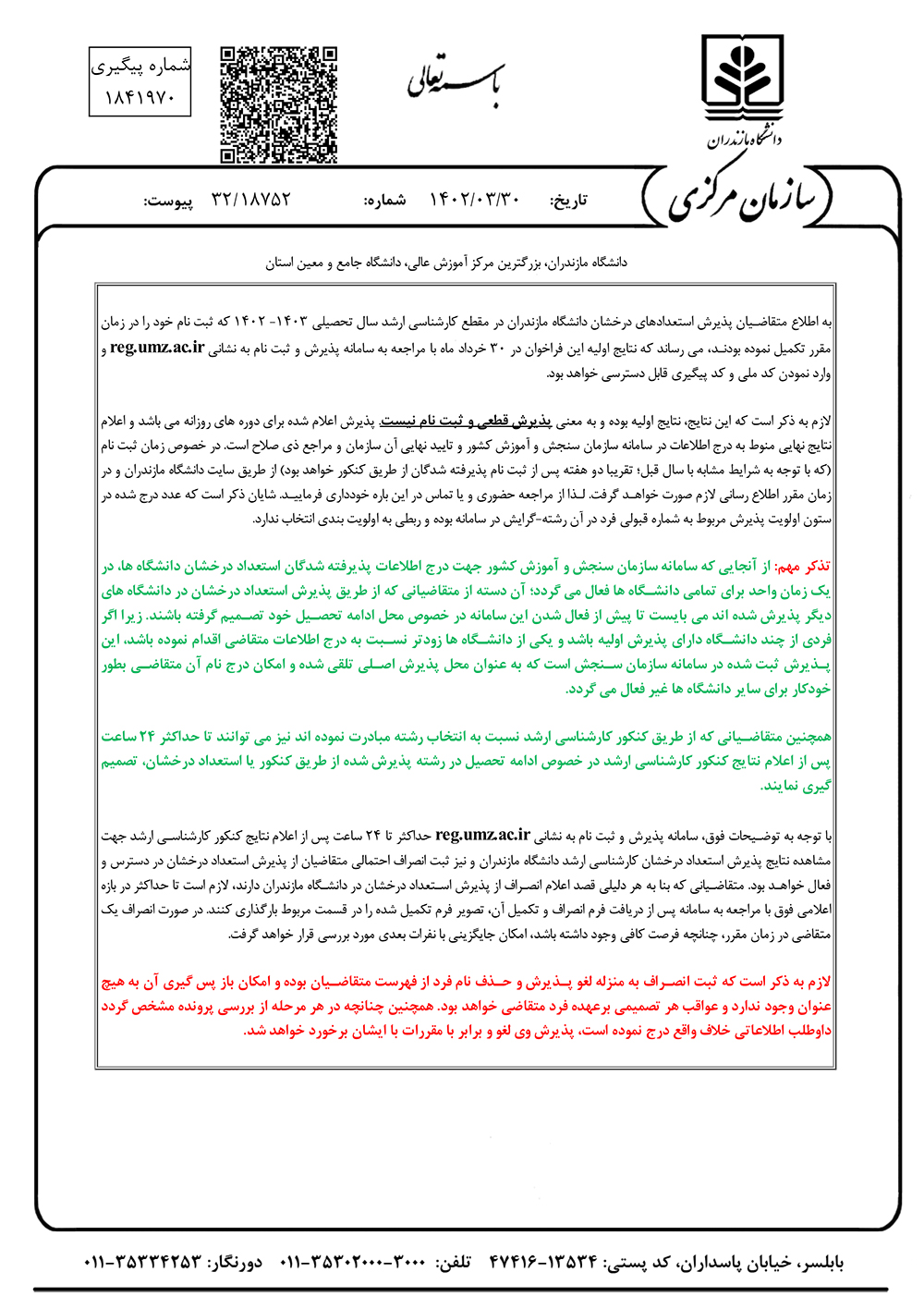 اعلام نتایج اولیه پذیرش استعدادهای درخشان در مقطع کارشناسی ارشد سال تحصیلی 1403 - 1402 - دانشگاه مازندران