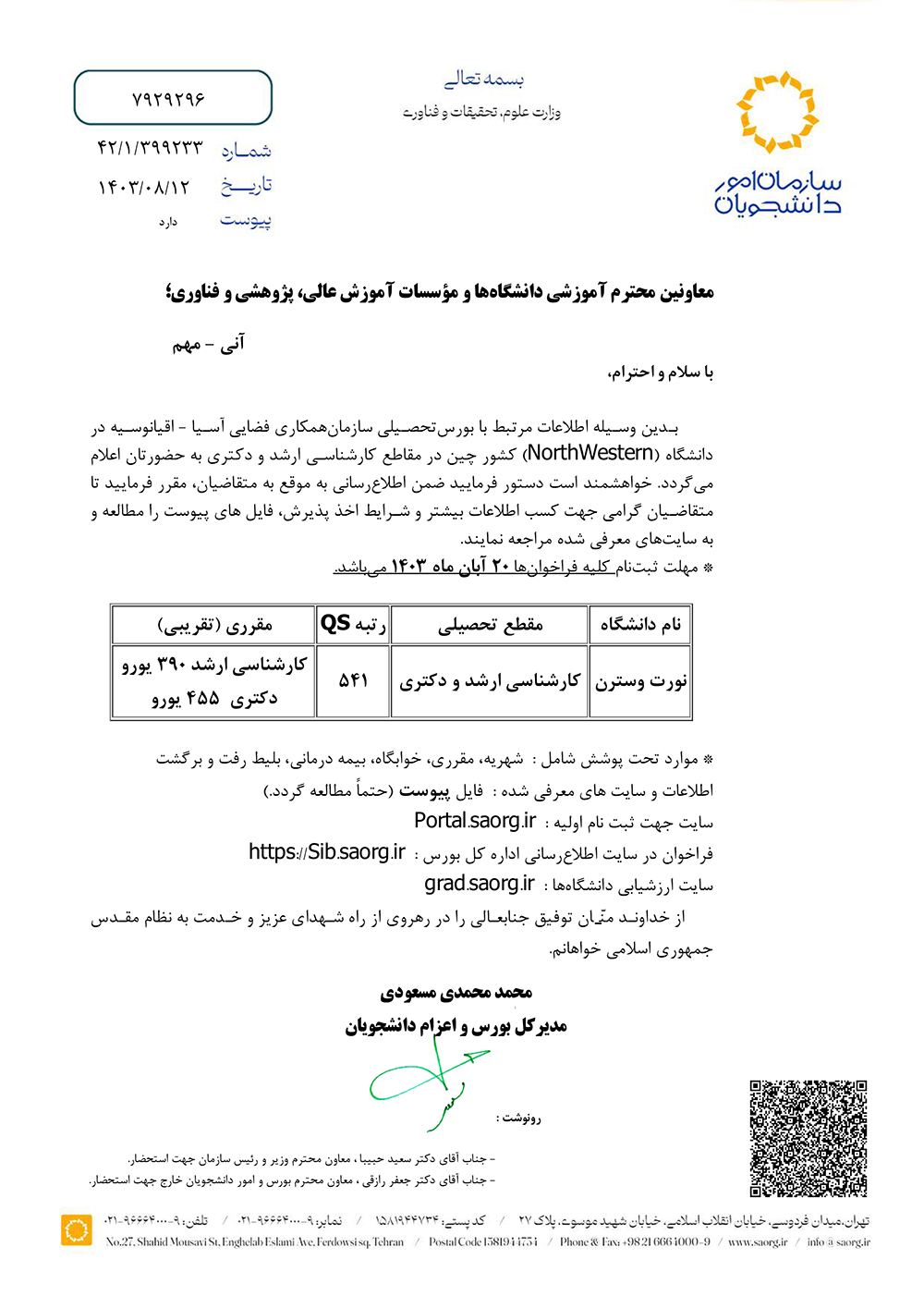 معرفی بورس دولت چین دانشگاه نورت و سترن