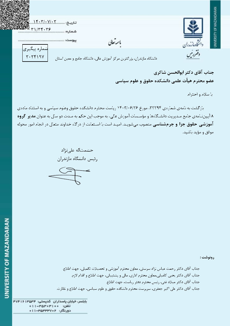 به گزارش روابط عمومی دانشکده حقوق و علوم سیاسی، طی حکمی از سوی دکتر حشمتالله علینژاد رییس دانشگاه، دکتر ابوالحسن شاکری عضو هیات علمی دانشکده حقوق و علوم سیاسی به عنوان مدیر گروه حقوق جزا و جرمشناسی منصوب گردید.